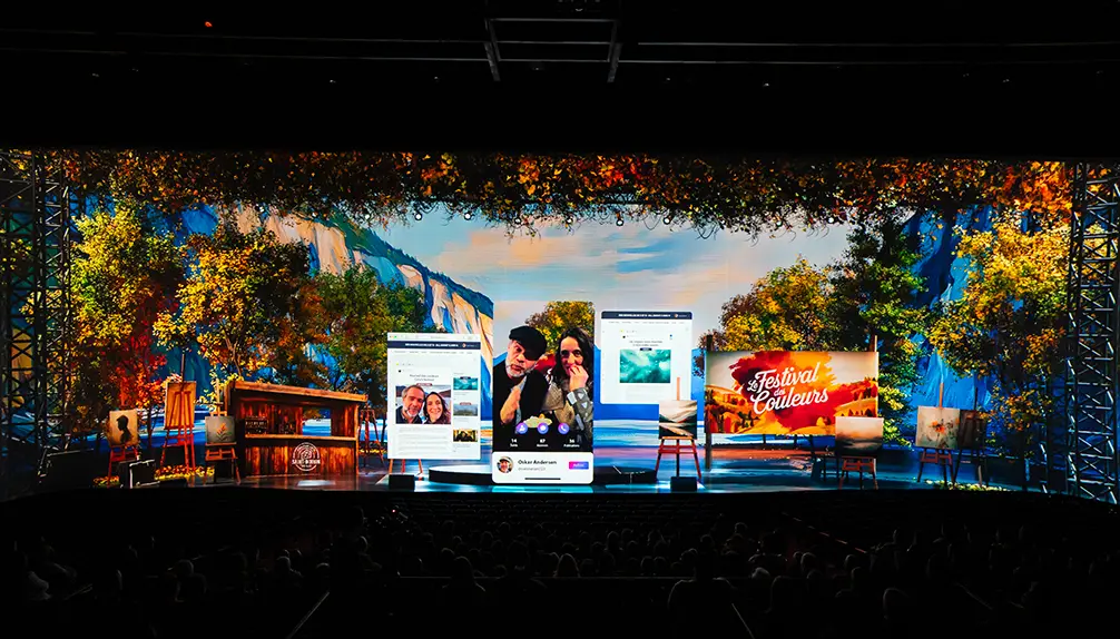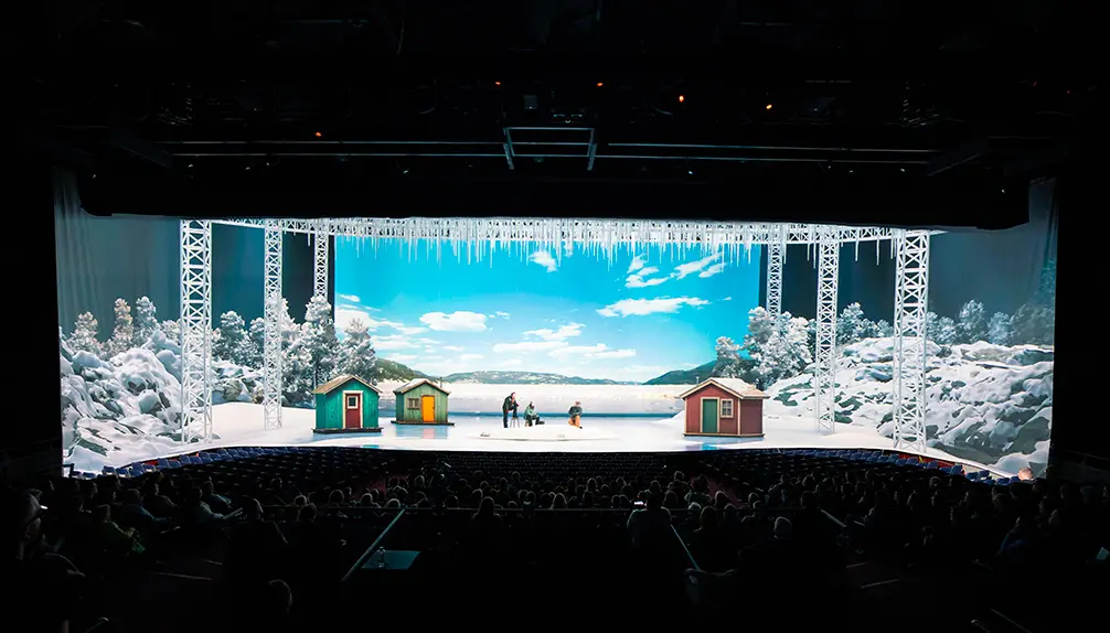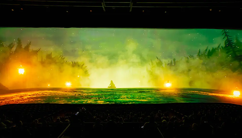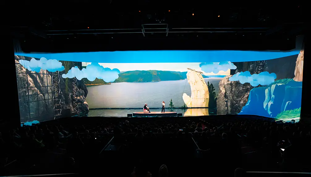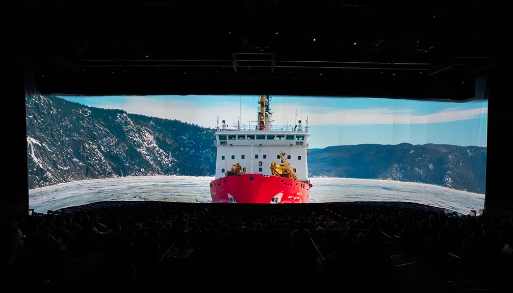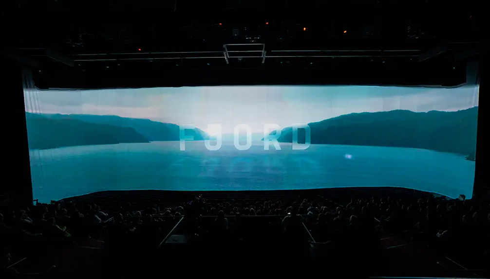 A giant curved screen and a spatial sound system immerse the audience in the real and fictional universe of the fjord. Scientific and historical facts intertwine and collide with ancestral tales and oral traditions.