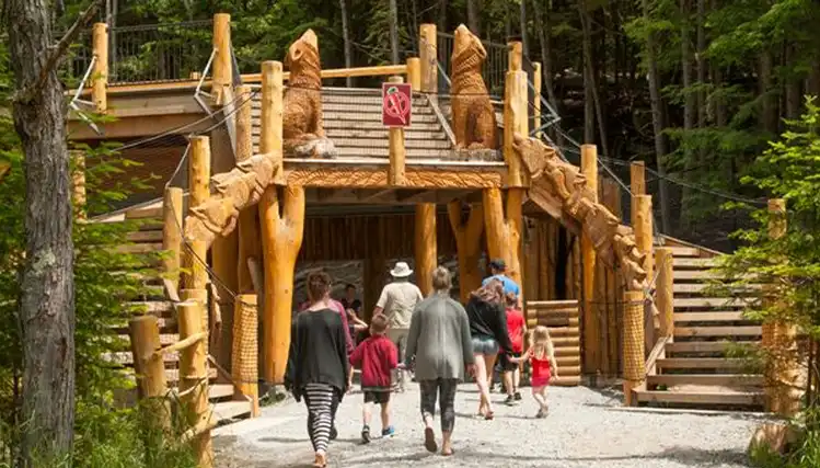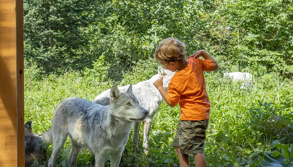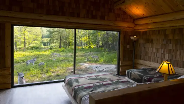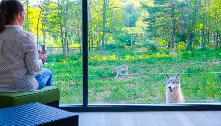 For year-round accommodations, there are several types, such as pod habitats offering simplicity and enchantment. Visitors can also take advantage of the “Sleeping with Wolves” experience, whether in rustic log cabins or in a modern setting, and immerse themselves among a pack of wolves, a unique experience in North America. Featuring full-glass fronts, these accommodations offer a panoramic view of the wolves’ habitat, an unforgettable face-to-face experience with this legendary species. New units, the panoramic chalets, have also been added to the immersive Parc Omega experience. Modern and luxurious, these units can accommodate families and friends of four persons. Staying in these units fits in perfectly with the Outaouais’s mountainous, rocky backdrop, and brings you up close to wild animals such as fallow deer and white-tailed deer. The area also features 5 km walking trails and a private lookout where you can observe a wolf pack. The cottages also feature a terrace with spa, barbecue and breathtaking views of the vast surrounding territory.